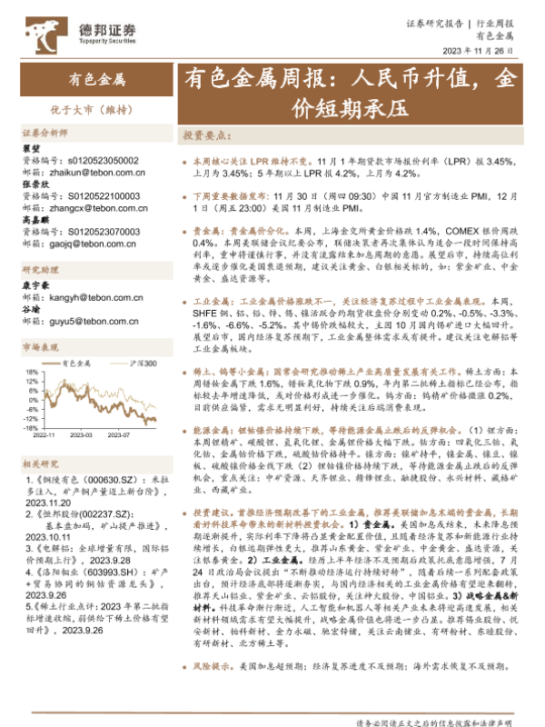 【德邦证券】【20231126】20231126-德邦证券-有色金属周报:人民币升值,金价短期承压-25页
