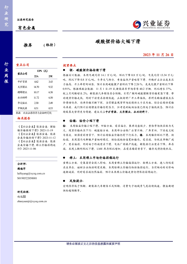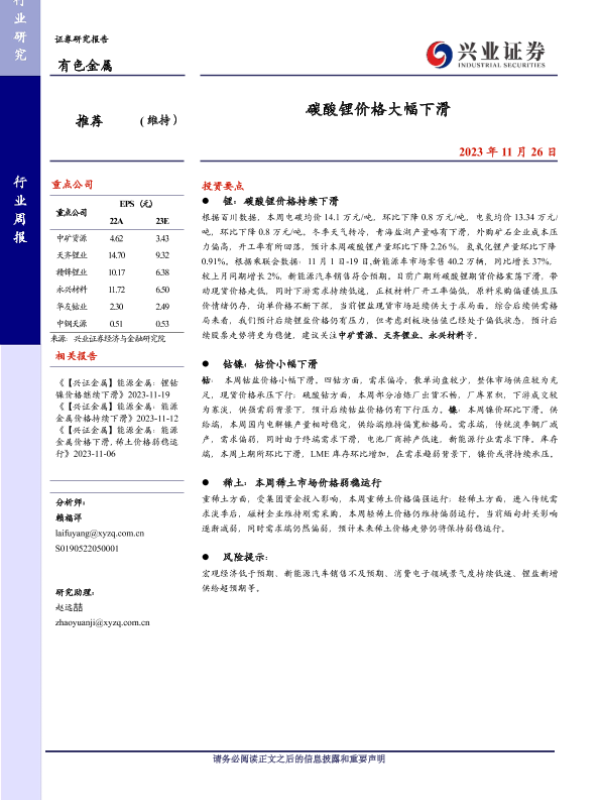 【兴业证券】【20231126】20231126-兴业证券-有色金属行业周报:碳酸锂价格大幅下滑-18页