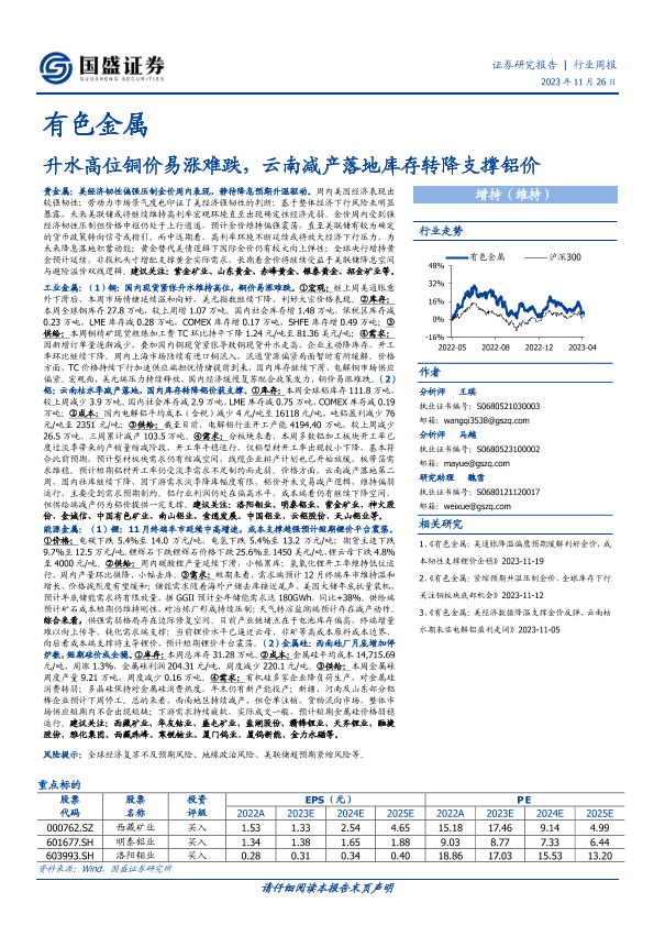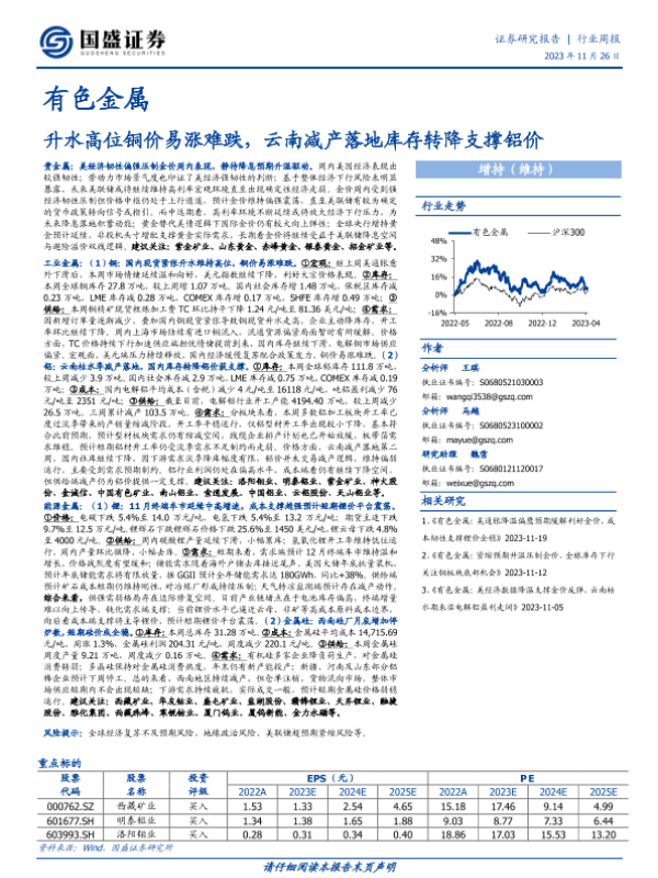 【国盛证券】【20231126】20231126-国盛证券-有色金属行业周报:升水高位铜价易涨难跌,云南减产落地库存转降支撑铝价-34页