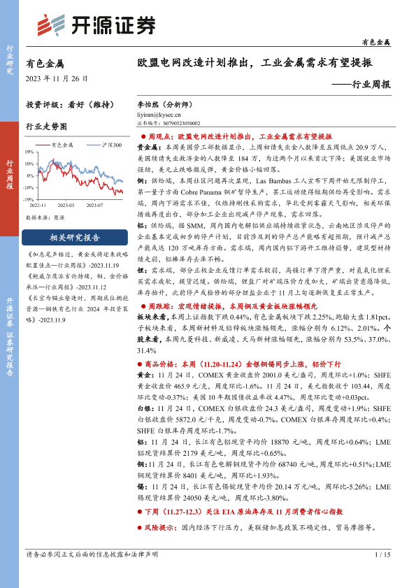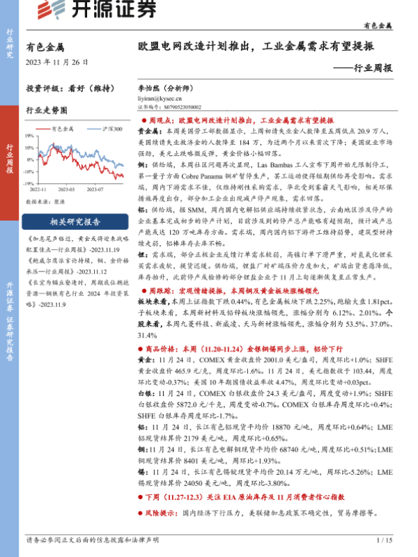 【开源证券】【20231126】20231126-开源证券-有色金属行业周报:欧盟电网改造计划推出,工业金属需求有望提振-15页