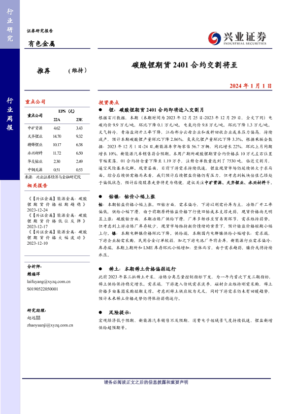 【兴业证券】【20240101】20240101-兴业证券-有色金属行业周报:碳酸锂期货2401合约交割将至-18页