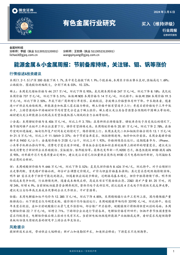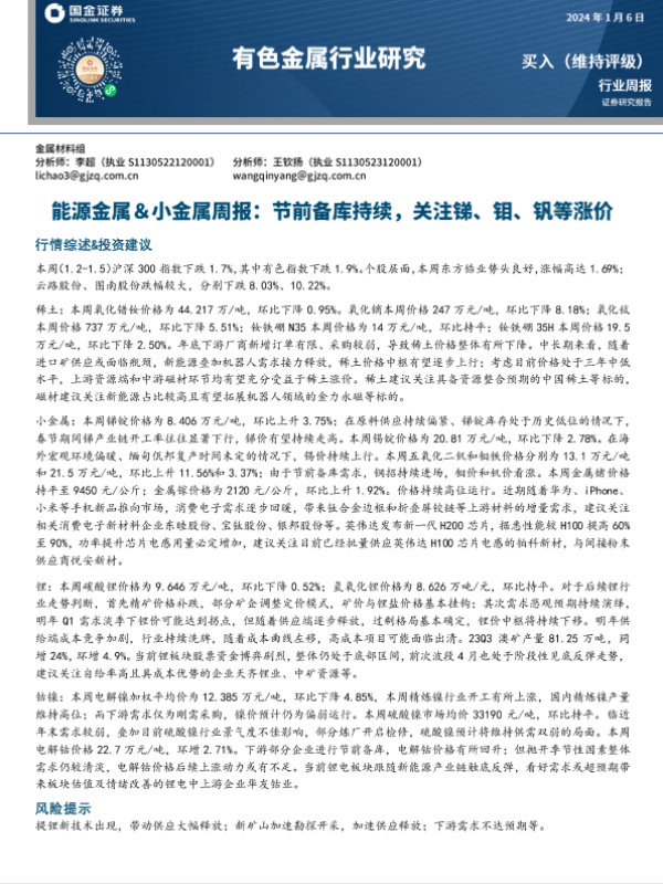 【国金证券】【20240106】20240106-国金证券-能源金属&小金属周报:节前备库持续,关注锑、钼、钒等涨价-18页