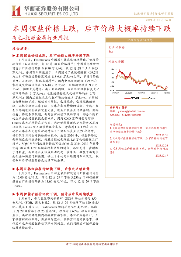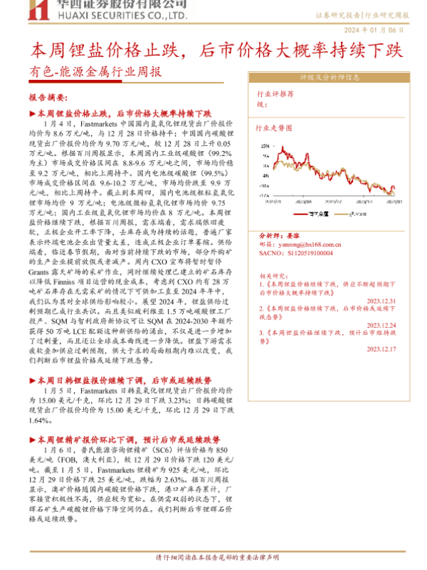 【华西证券】【20240106】20240106-华西证券-有色-能源金属行业周报:本周锂盐价格止跌,后市价格大概率持续下跌-20页