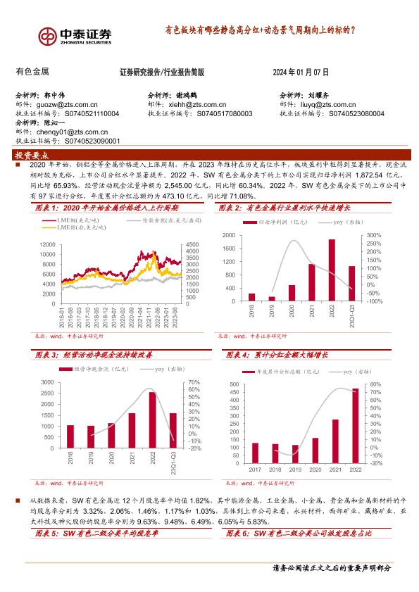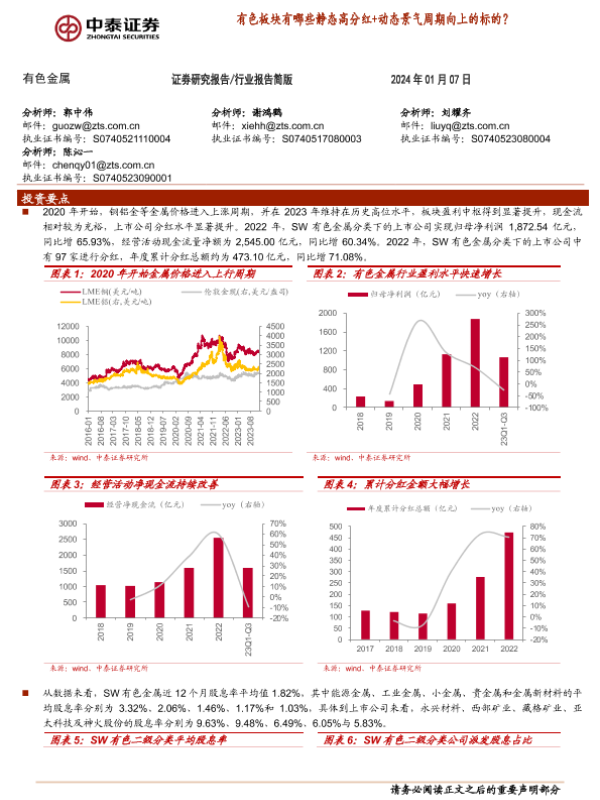 【中泰证券】【20240107】有色金属:有色板块有哪些静态高分红+动态景气周期向上的标的?-10页