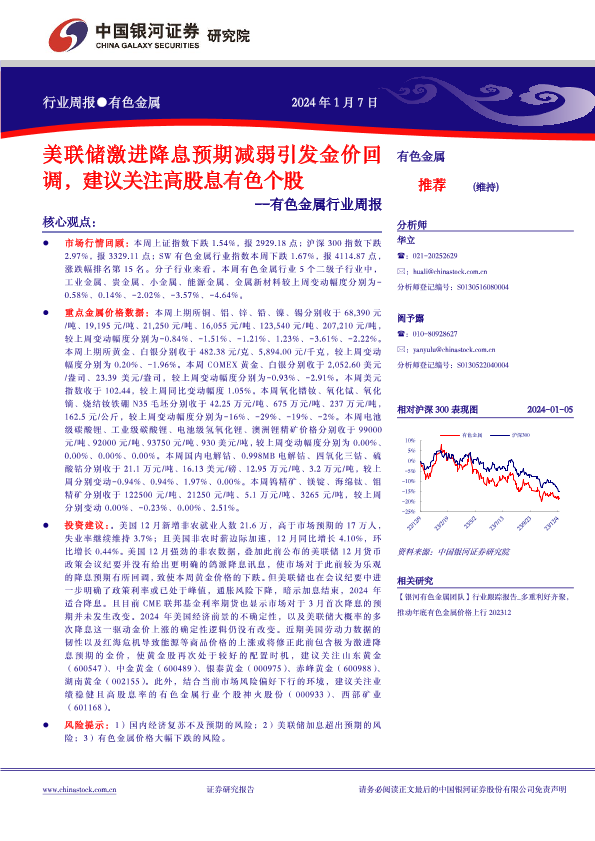 【银河证券】【20240107】20240107-中国银河-有色金属行业周报:美联储激进降息预期减弱引发金价回调,建议关注高股息有色个股-19页
