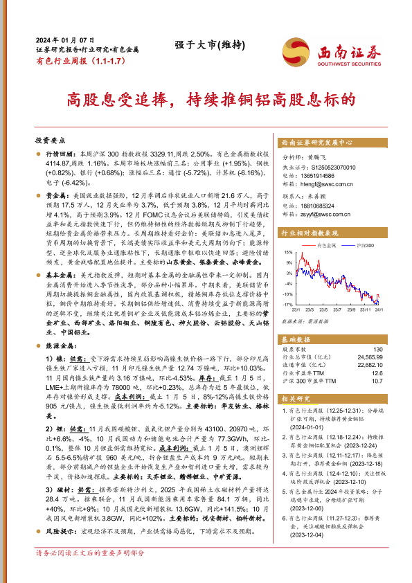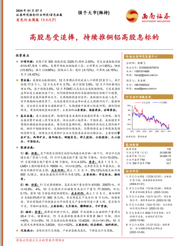 【西南证券】【20240107】20240107-西南证券-有色行业周报:高股息受追捧,持续推铜铝高股息标的-23页