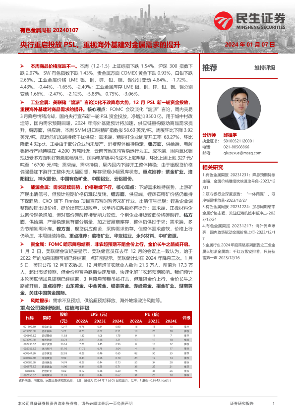 【民生证券】【20240107】20240107-民生证券-有色金属周报:央行重启投放PSL,重视海外基建对金属需求的提升-27页