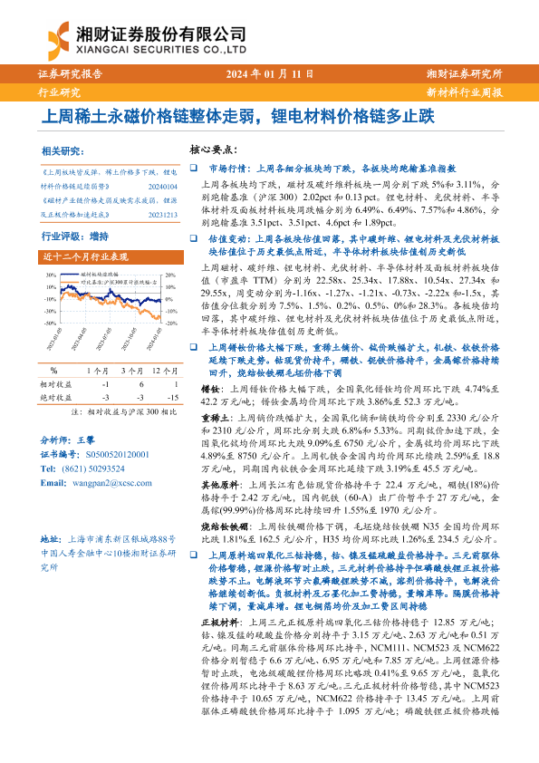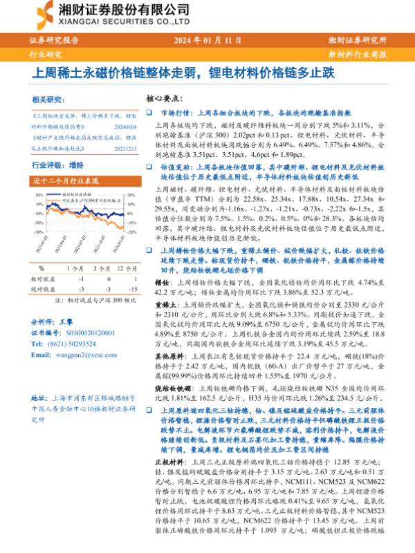 【湘财证券】【20240111】20240111-湘财证券-新材料行业周报:上周稀土永磁价格链整体走弱,锂电材料价格链多止跌-11页