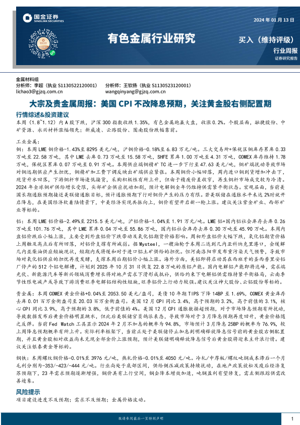 【国金证券】【20240113】20240113-国金证券-有色金属行业研究:大宗及贵金属周报:美国CPI不改降息预期,关注黄金股右侧配置期-14页