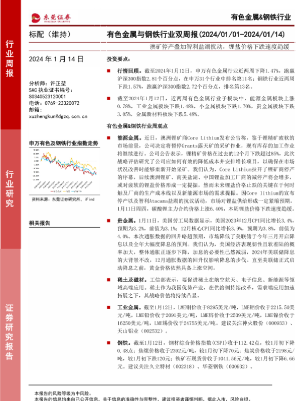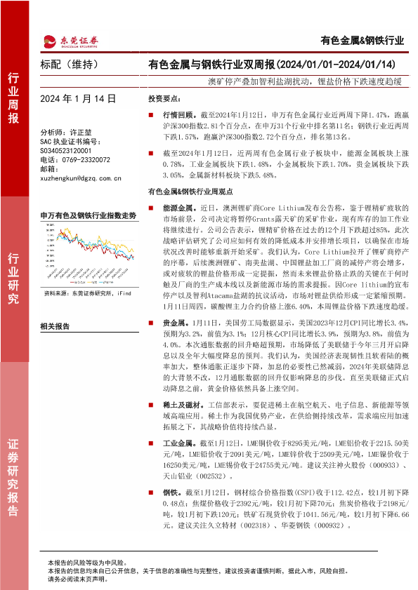 【东莞证券】【20240114】20240114-东莞证券-有色金属与钢铁行业双周报:澳矿停产叠加智利盐湖扰动,锂盐价格下跌速度趋缓-15页