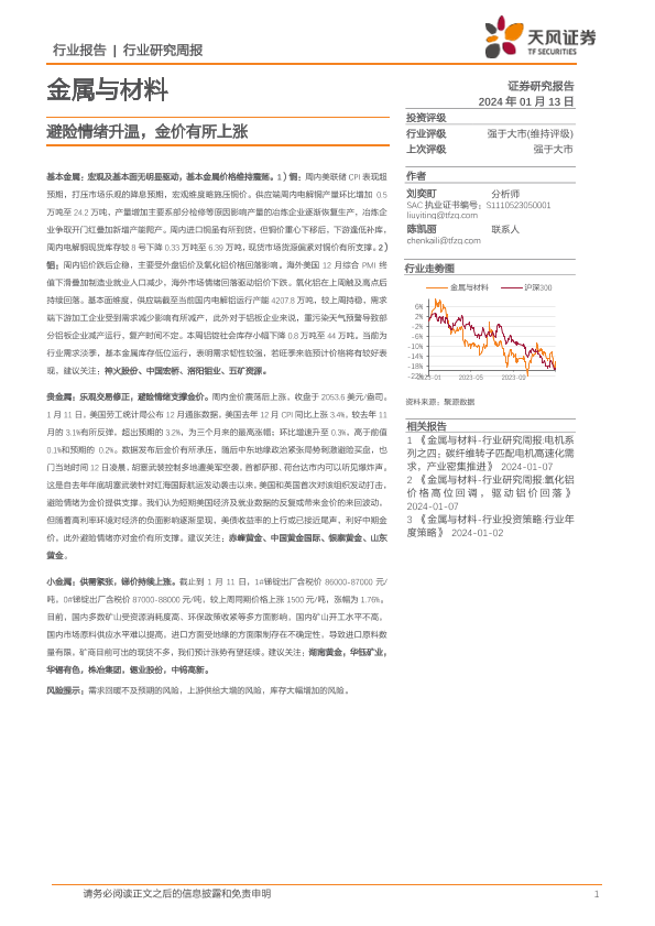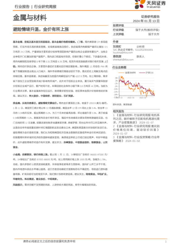 【天风证券】【20240113】金属与材料行业研究周报:避险情绪升温,金价有所上涨-16页