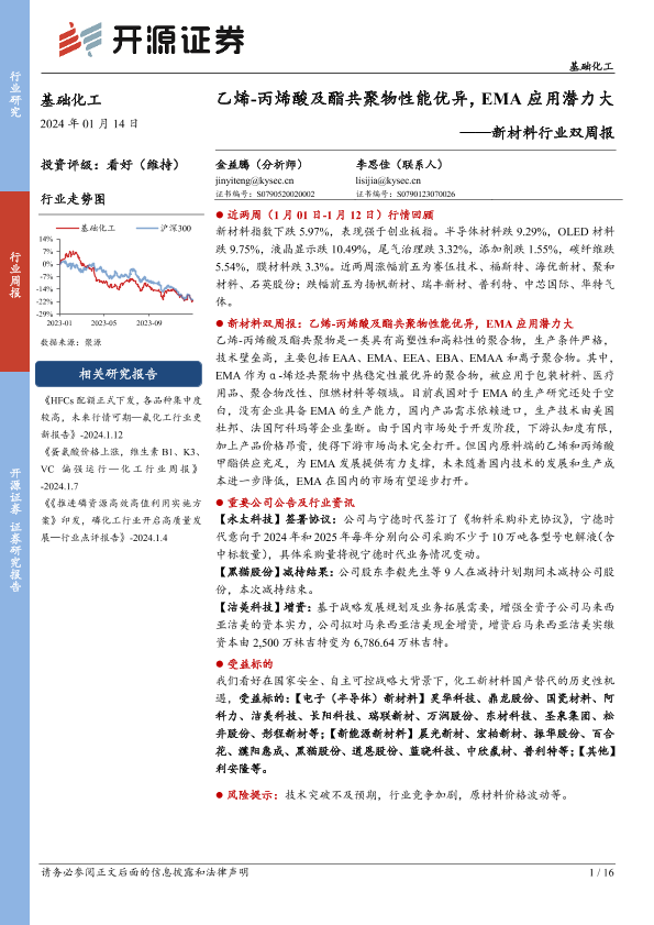 【开源证券】【20240114】20240114-开源证券-新材料行业双周报:乙烯-丙烯酸及酯共聚物性能优异,EMA应用潜力大-16页