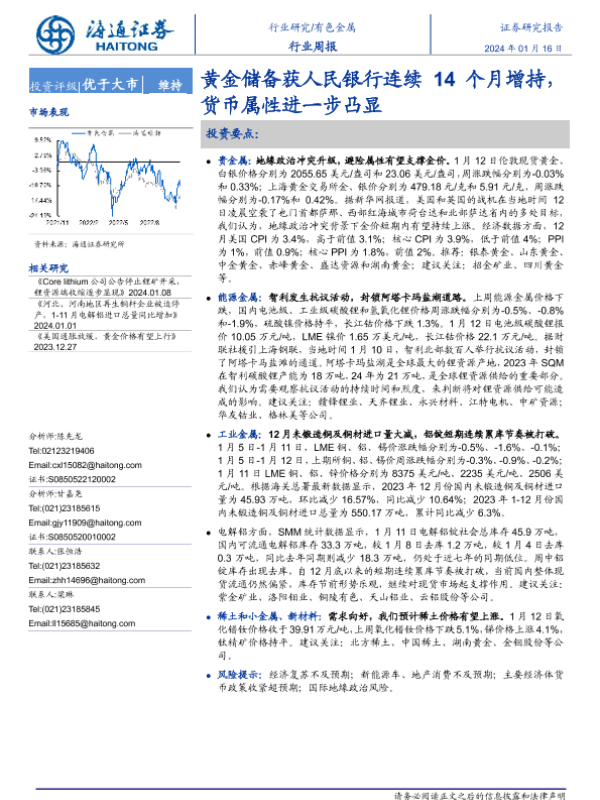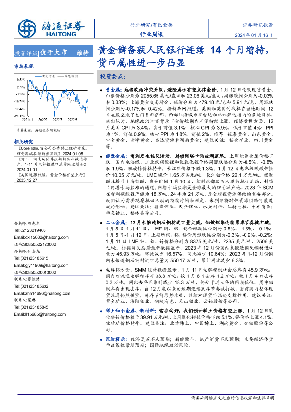 【海通证券】【20240116】20240116-海通证券-有色金属行业周报:黄金储备获人民银行连续14个月增持,货币属性进一步凸显-15页