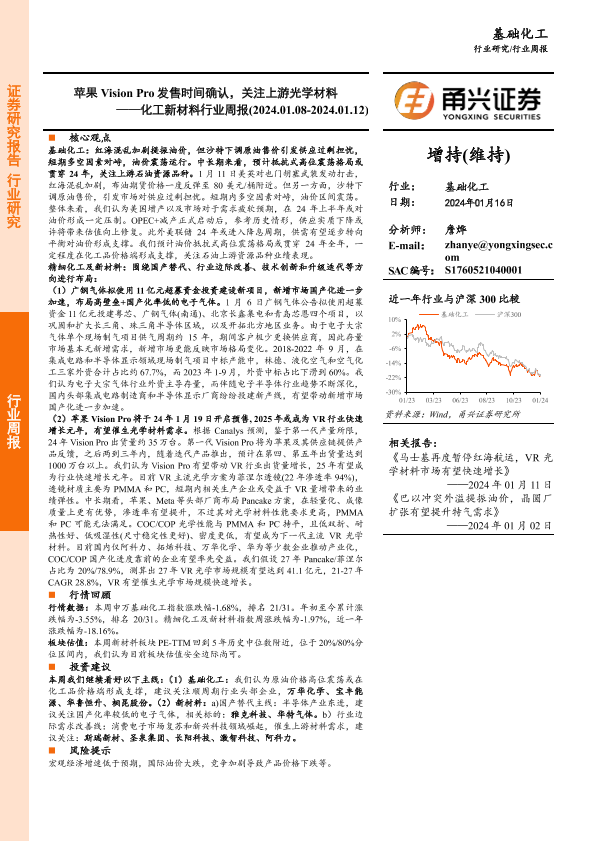 【甬兴证券】【20240116】20240116-甬兴证券-化工新材料行业周报:苹果Vision Pro发售时间确认,关注上游光学材料-19页