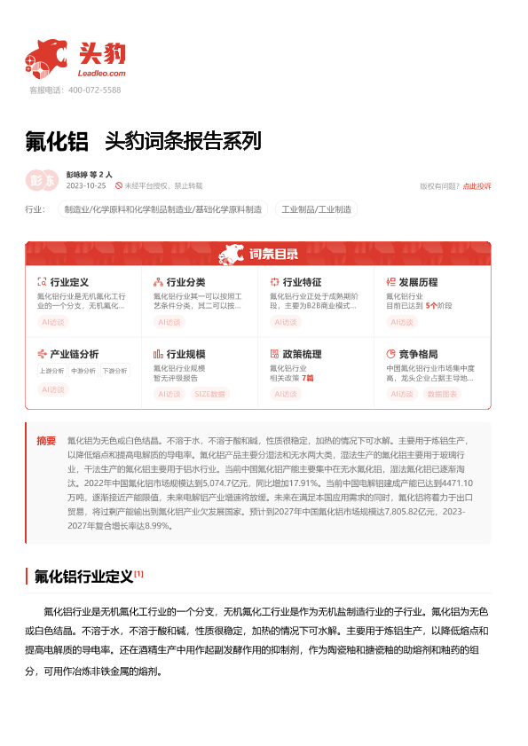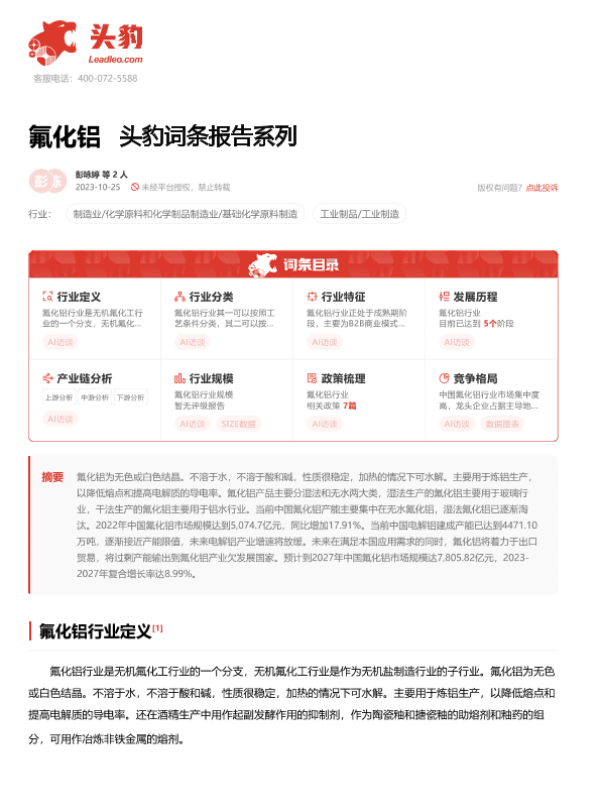 【头豹研究院】【20231025】20240119-头豹研究院-氟化铝 头豹词条报告系列-20页