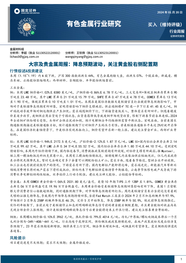 【国金证券】【20240120】20240120-国金证券-大宗及贵金属周报:降息预期波动,关注黄金股右侧配置期-15页