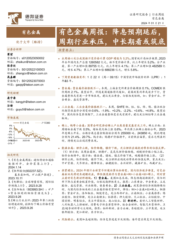 【德邦证券】【20240121】20240121-德邦证券-有色金属周报:降息预期延后,周期行业承压,中长期看或筑底-25页