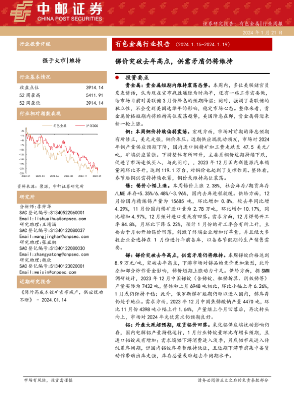 【中邮证券】【20240121】20240121-中邮证券-有色金属行业周报:锑价突破去年高点,供需矛盾仍将维持-15页