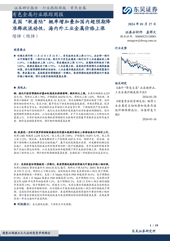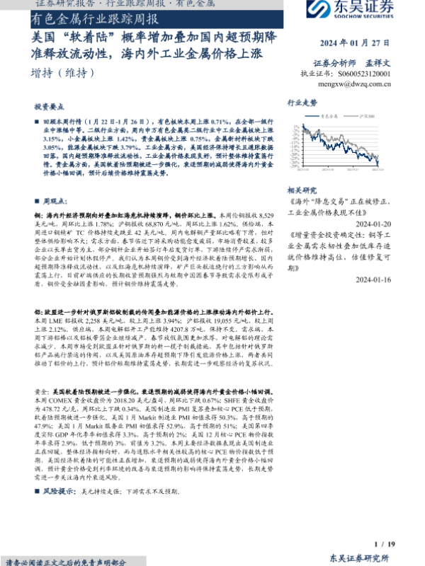 【东吴证券】【20240127】20240127-东吴证券-有色金属行业跟踪周报:美国“软着陆”概率增加叠加国内超预期降准释放流动性,海内外工业金属价格上涨-19页