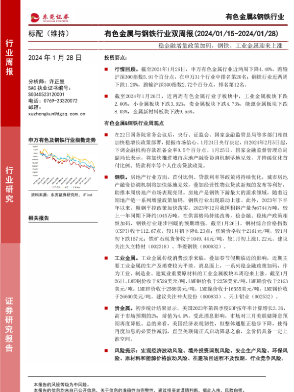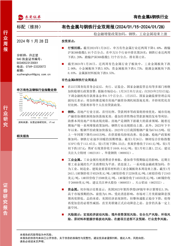 【东莞证券】【20240128】20240128-东莞证券-有色金属与钢铁行业双周报:稳金融增量政策加码,钢铁、工业金属迎来上涨-15页