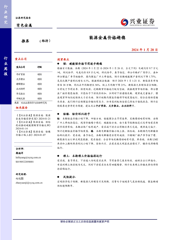 【兴业证券】【20240128】20240128-兴业证券-有色金属行业周报:能源金属价格趋稳-18页