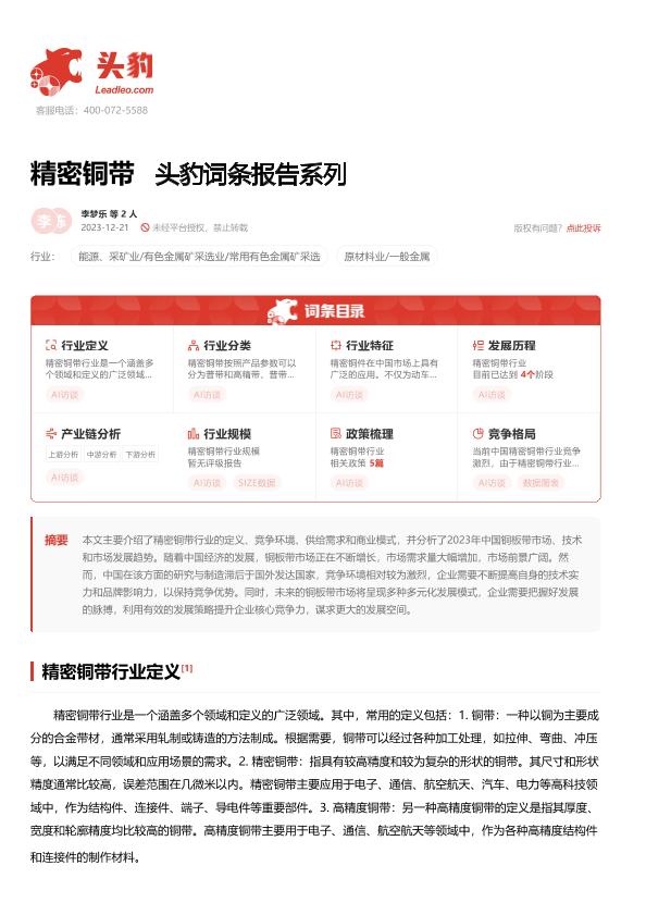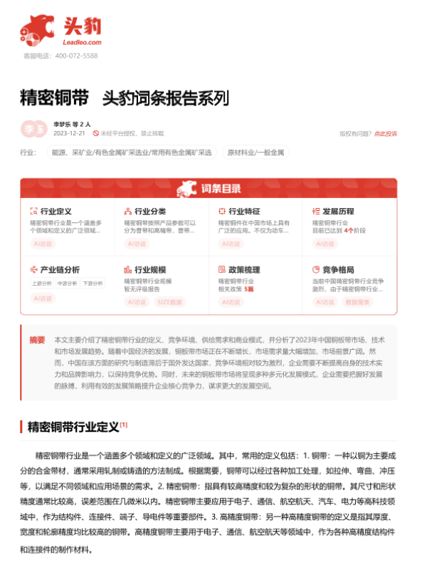 【头豹研究院】【20240130】20240130-头豹研究院-精密铜带 头豹词条报告系列-20页