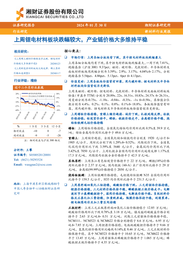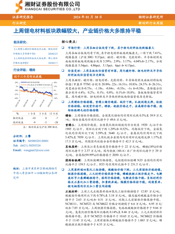 【湘财证券】【20240130】20240130-湘财证券-新材料行业周报:上周锂电材料板块跌幅较大,产业链价格大多维持平稳-12页
