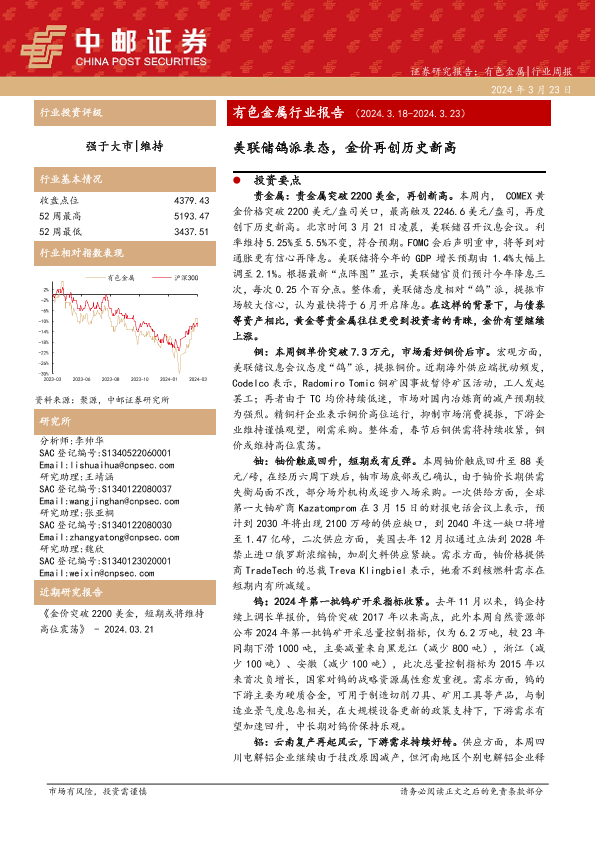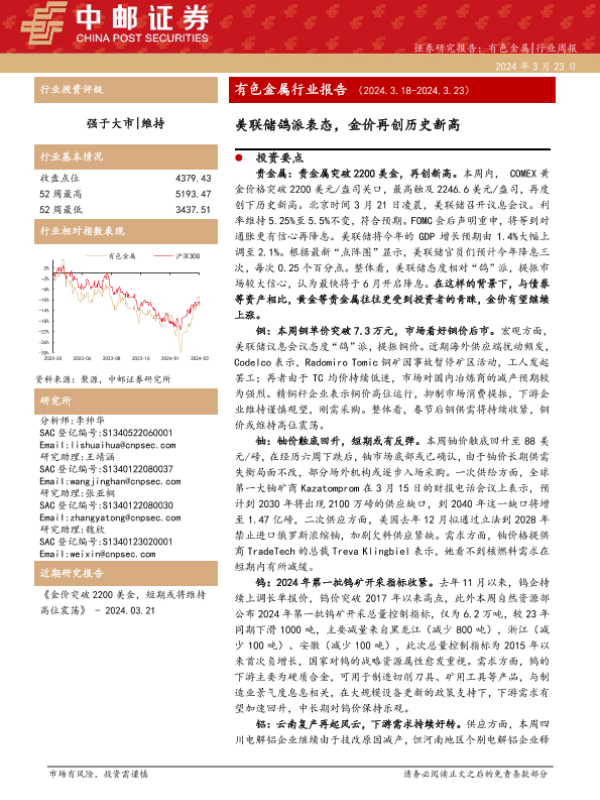 【中邮证券】【20240323】20240323-中邮证券-有色金属行业报告:美联储鸽派表态,金价再创历史新高-13页