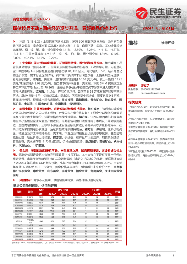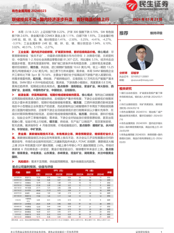 【民生证券】【20240323】20240323-民生证券-有色金属周报:联储按兵不动+国内经济逐步升温,看好商品价格上行-28页
