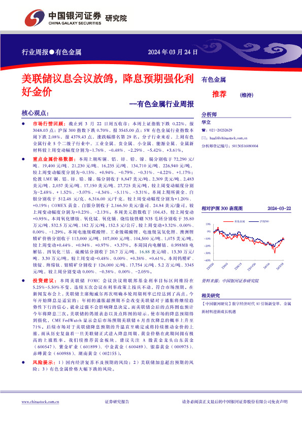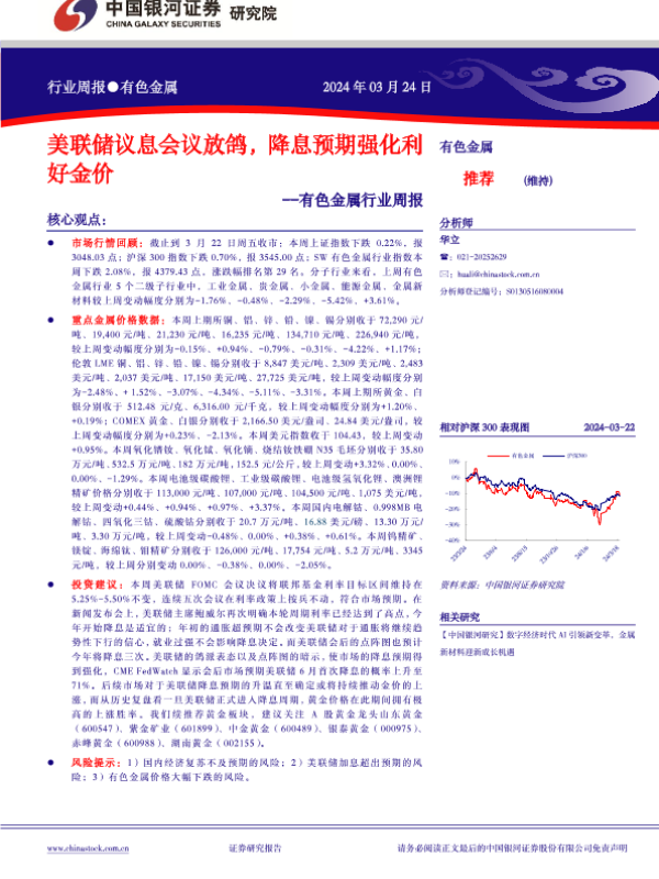 【银河证券】【20240324】中国银河-有色金属行业周报:美联储议息会议放鸽,降息预期强化利好金价-17页