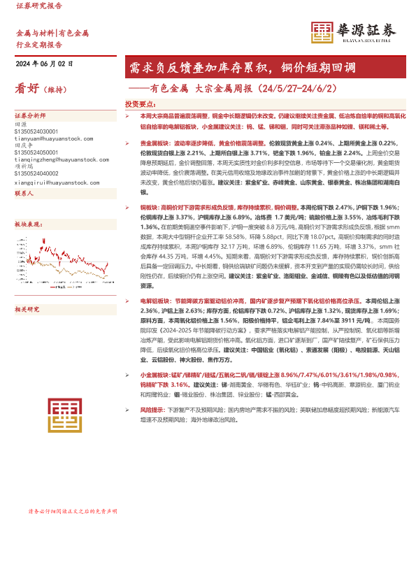 【华源证券】【20240602】20240602-华源证券-有色金属 大宗金属周报:需求负反馈叠加库存累积,铜价短期回调-18页