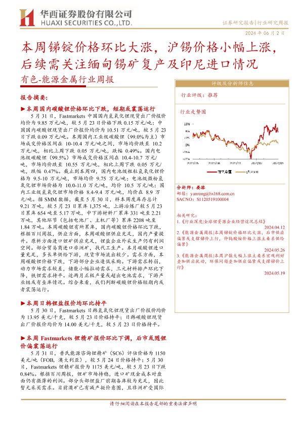 【华西证券】【20240602】20240602-华西证券-有色-能源金属行业周报:本周锑锭价格环比大涨,沪锡价格小幅上涨,后续需关注缅甸锡矿复产及印尼进口情况-20页