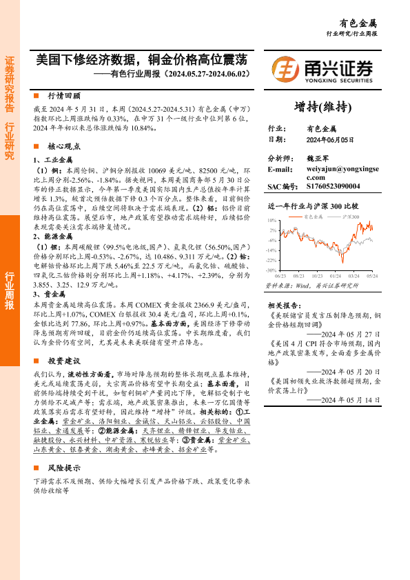 【甬兴证券】【20240605】20240605-甬兴证券-有色行业周报:美国下修经济数据,铜金价格高位震荡-16页