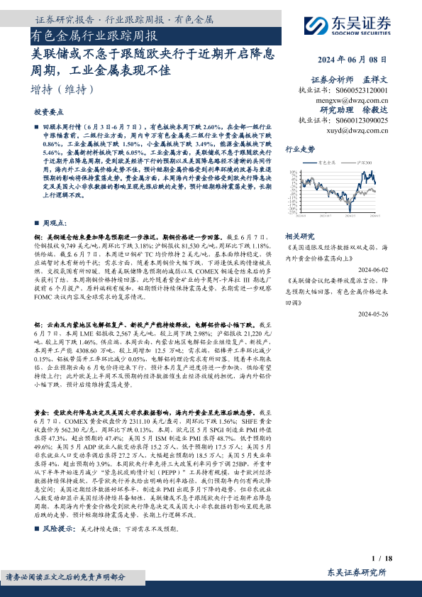 【东吴证券】【20240608】20240608-东吴证券-有色金属行业跟踪周报:美联储或不急于跟随欧央行于近期开启降息周期,工业金属表现不佳-18页