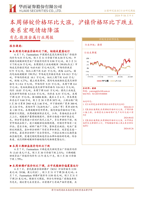 【华西证券】【20240609】20240609-华西证券-有色-能源金属行业周报:本周锑锭价格环比大涨,沪镍价格环比下跌主要系宏观情绪降温-21页