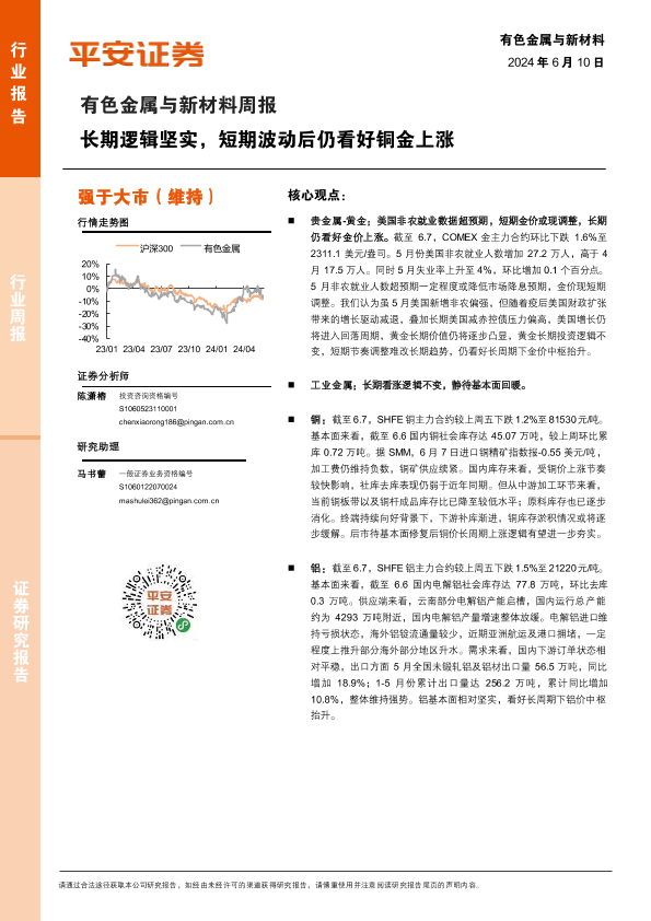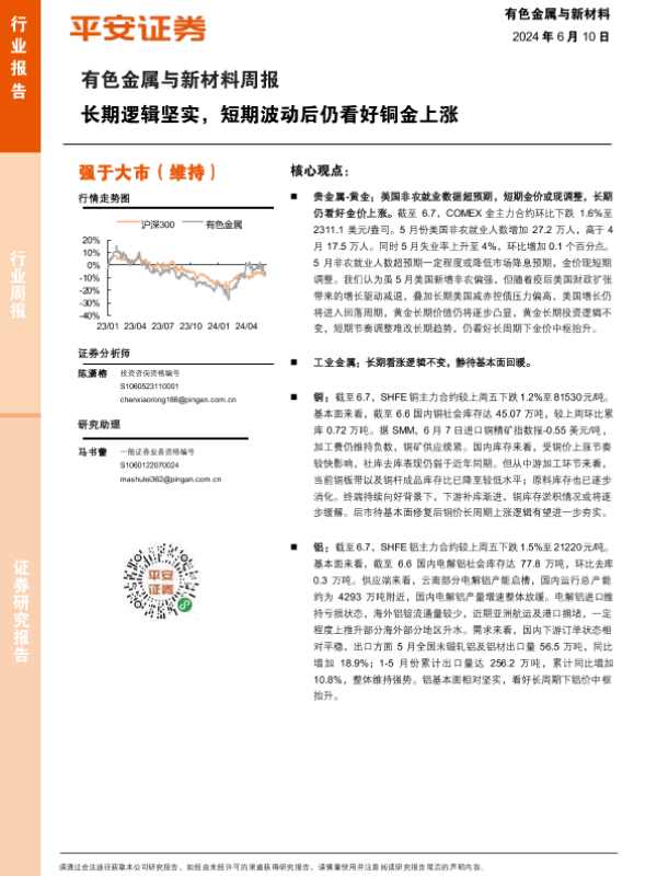 【平安证券】【20240610】20240610-平安证券-有色金属与新材料周报:长期逻辑坚实,短期波动后仍看好铜金上涨-12页
