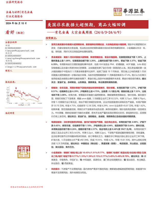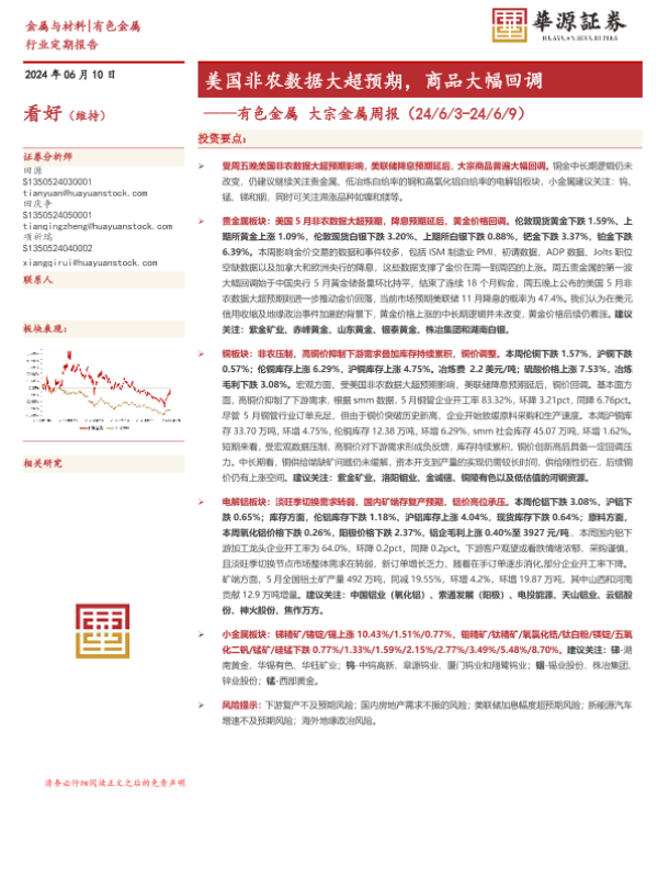 【华源证券】【20240610】20240610-华源证券-有色金属大宗金属周报:美国非农数据大超预期,商品大幅回调-18页