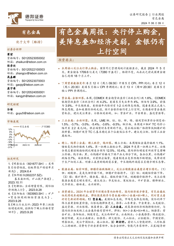 【德邦证券】【20240609】20240609-德邦证券-有色金属行业周报:央行停止购金,美降息叠加经济走弱,金银仍有上行空间-26页