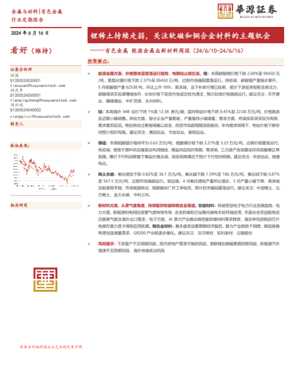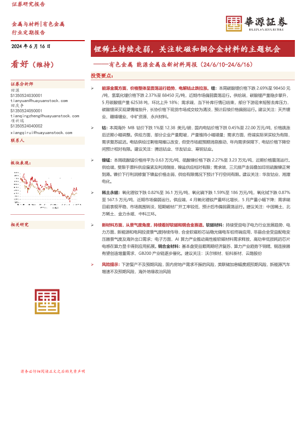 【华源证券】【20240616】20240616-华源证券-有色金属 能源金属&新材料周报:锂稀土持续走弱,关注软磁和铜合金材料的主题机会-15页