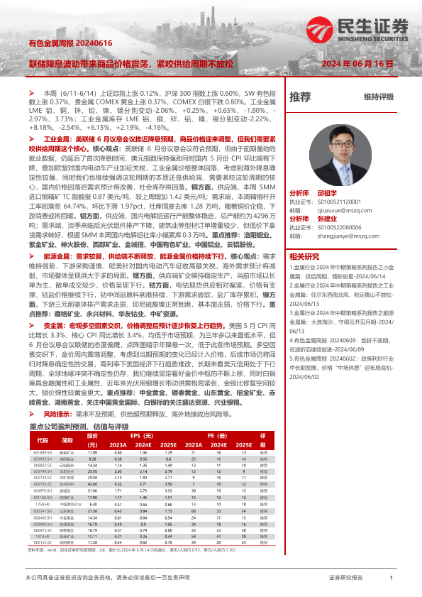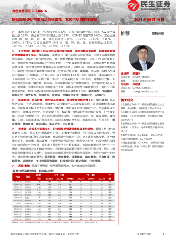 【民生证券】【20240616】20240616-民生证券-有色金属行业周报:联储降息波动带来商品价格震荡,紧咬供给周期不放松-29页