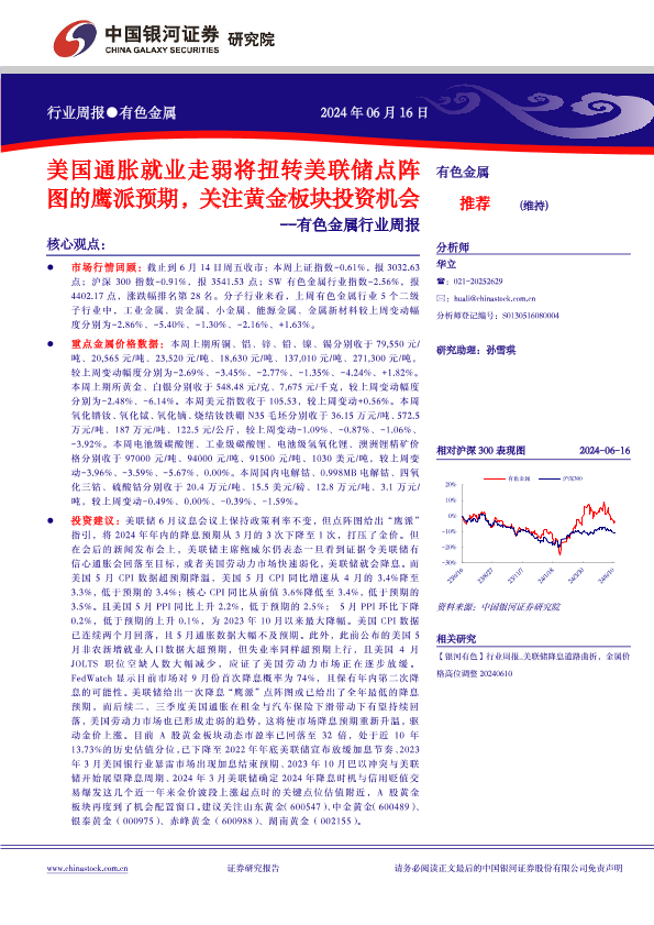 【银河证券】【20240616】20240616-中国银河-有色金属行业周报:美国通胀就业走弱将扭转美联储点阵图的鹰派预期,关注黄金板块投资机会-18页