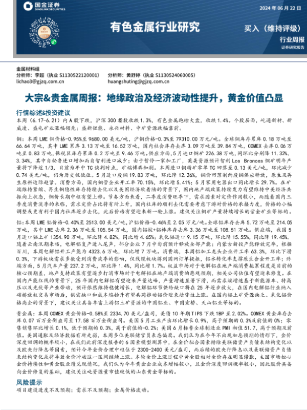 【国金证券】【20240622】国金证券-大宗&贵金属周报:地缘政治及经济波动性提升,黄金价值凸显-15页