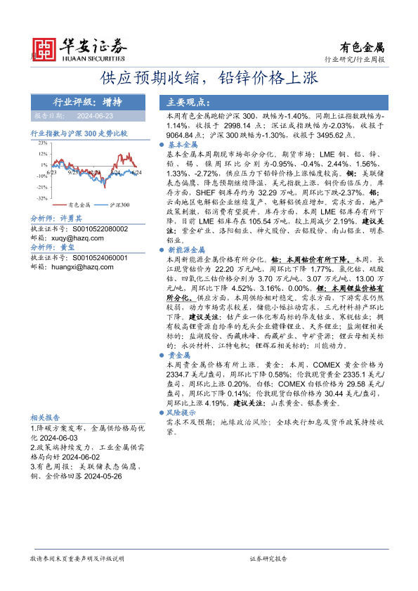 【华安证券】【20240623】供应预期收缩,铅锌价格上涨-14页