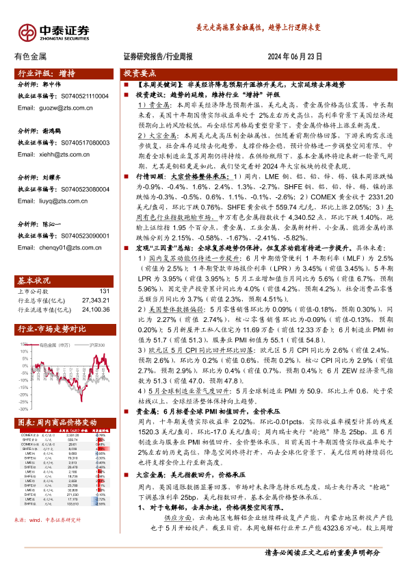 【中泰证券】【20240623】20240623-中泰证券-有色金属行业周报:美元走高拖累金融属性,趋势上行逻辑未变-37页