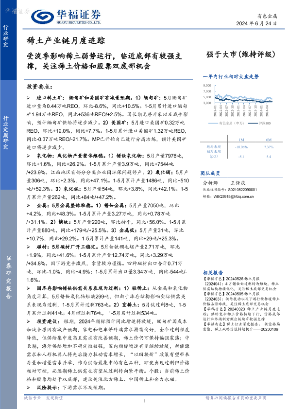 【华福证券】【20240624】20240624-华福证券-稀土产业链月度追踪:受淡季影响稀土弱势运行,临近底部有较强支撑,关注稀土价格和股票双底部机会-19页