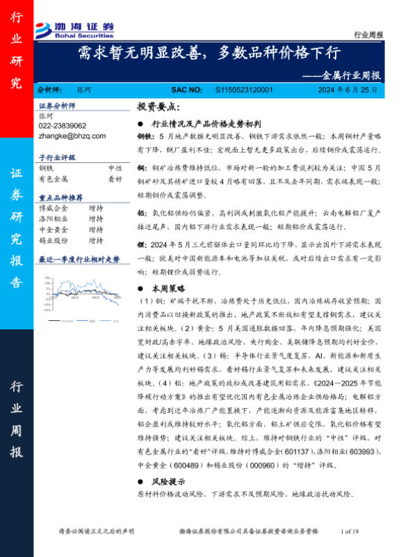 【渤海证券】【20240625】20240625-渤海证券-金属行业周报:需求暂无明显改善,多数品种价格下行-19页