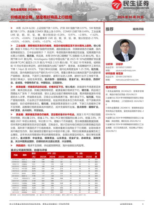 【民生证券】【20240630】20240630-民生证券-有色金属周报:价格逐渐企稳,坚定看好商品上行趋势-29页