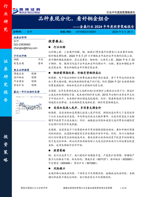 【渤海证券】【20240628】金属行业2024半年度投资策略报告:品种表现分化,看好铜金组合-28页