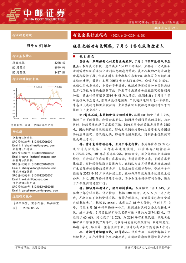 【中邮证券】【20240629】20240629-中邮证券-有色金属行业报告:强美元驱动有色调整,7月5日非农或为盘变点-14页