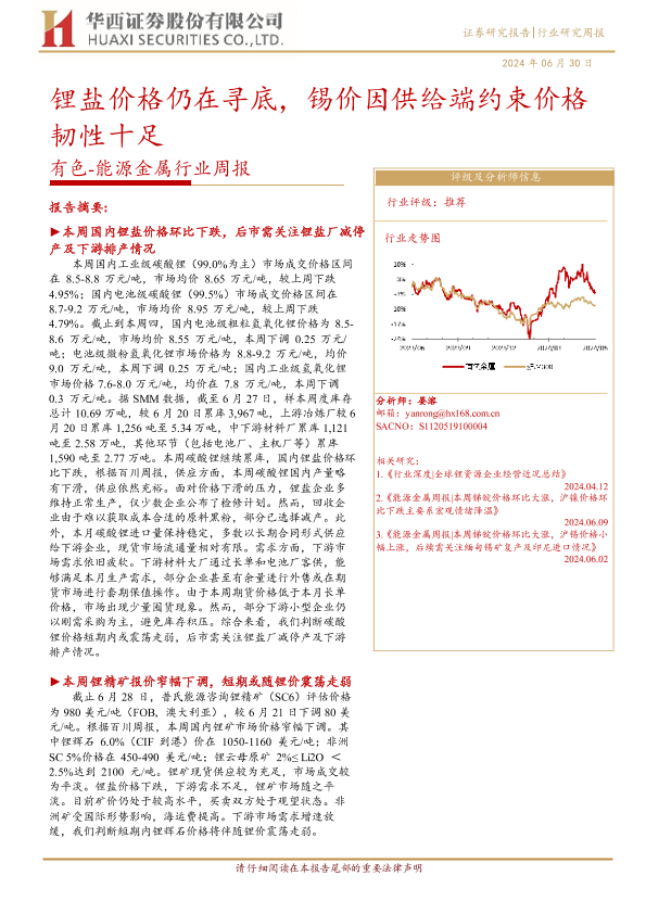 【华西证券】【20240630】20240630-华西证券-有色-能源金属行业周报:锂盐价格仍在寻底,锡价因供给端约束价格韧性十足-19页